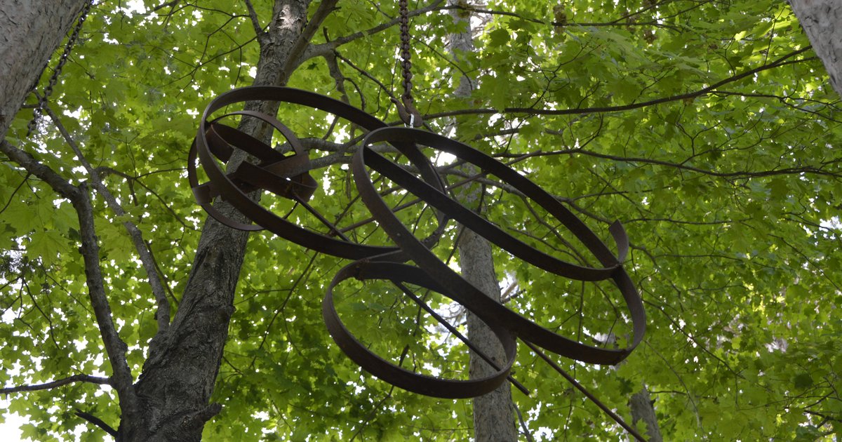 Most sculptures are meant to be seen, not heard. But when I walked beneath the twisted, hammered metal sculptures suspended from a row of red pine trees at Sand Forest Farm, there was something that tweaked my sonic imagination.